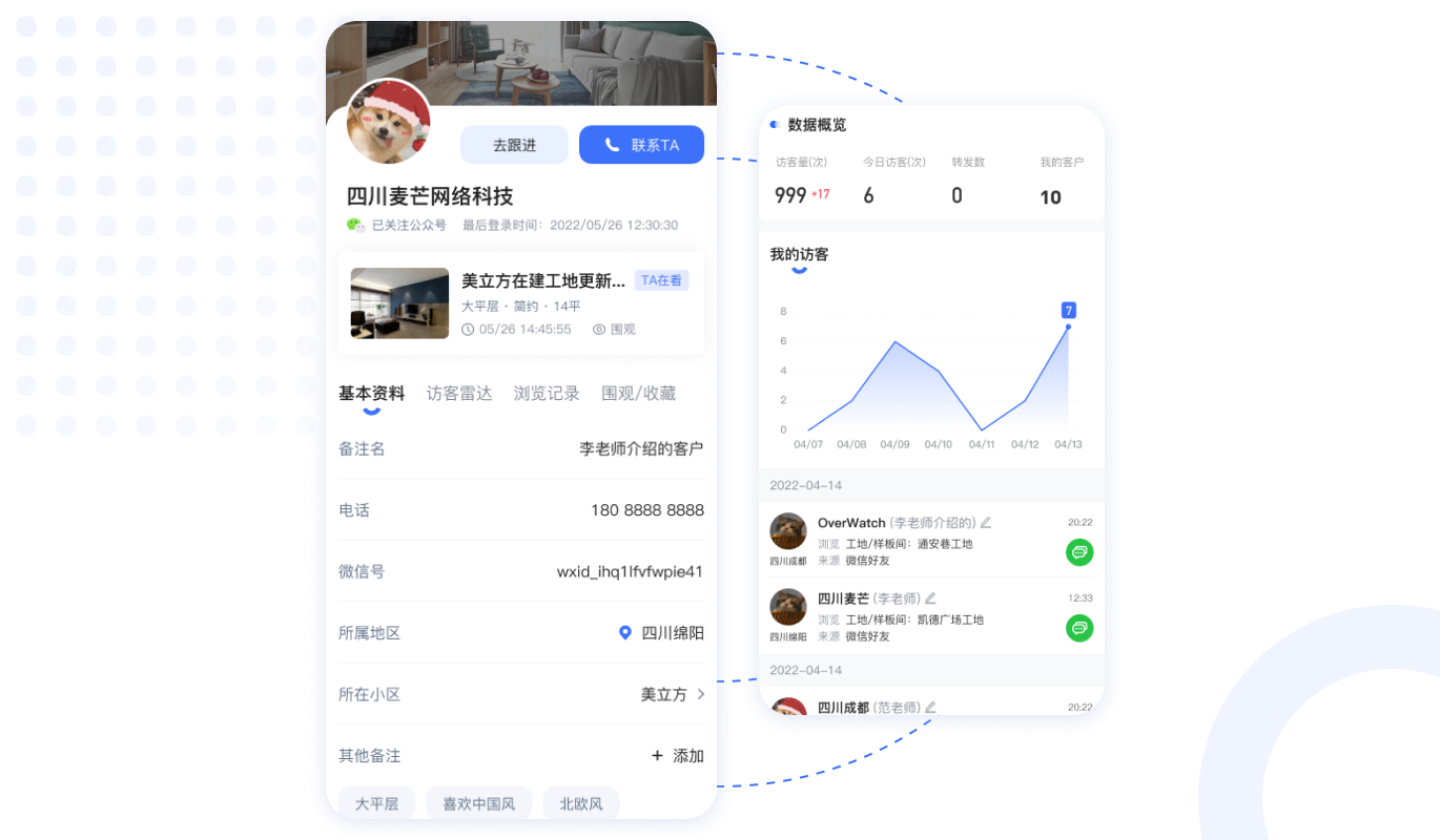 精準(zhǔn)引流,客戶軌跡追蹤推送、深度洞察客戶需求。 快速鎖客,直接對話消息及時提醒,增加量房量為銷售賦能。