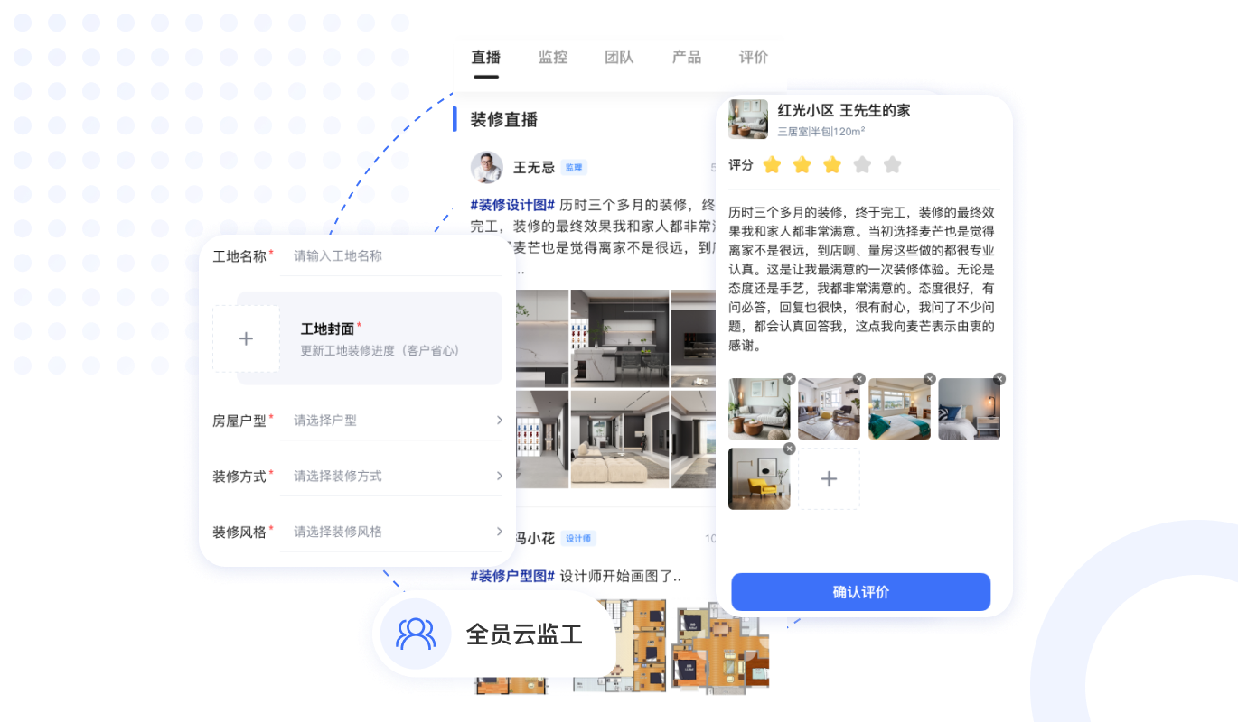 工地實時監(jiān)控直播,業(yè)主足不出戶,實時觀看裝修現(xiàn)場,工地圖文,視頻,VR全景實時更新,保證裝修進(jìn)度。