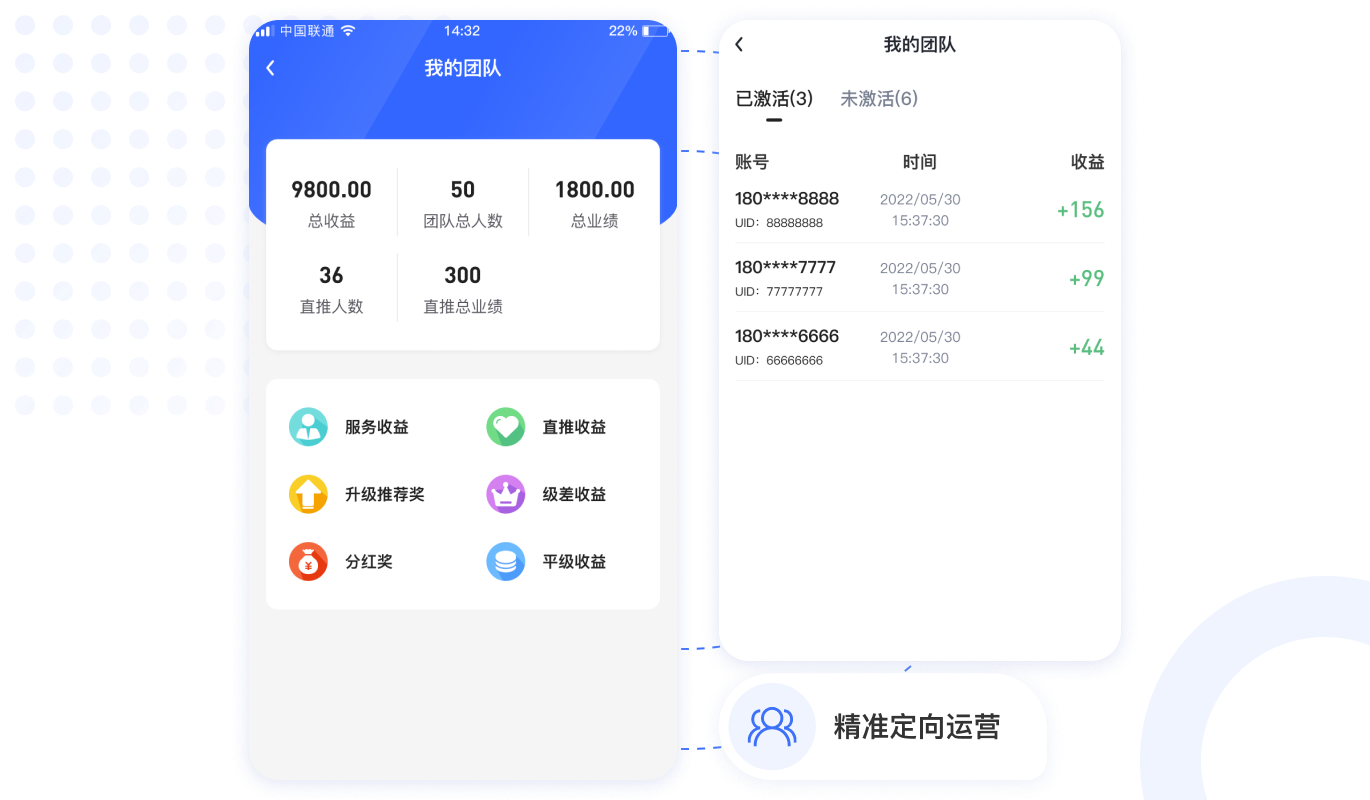 用戶激活收益,團(tuán)隊推薦獎,團(tuán)隊極差收益,快速裂變用戶